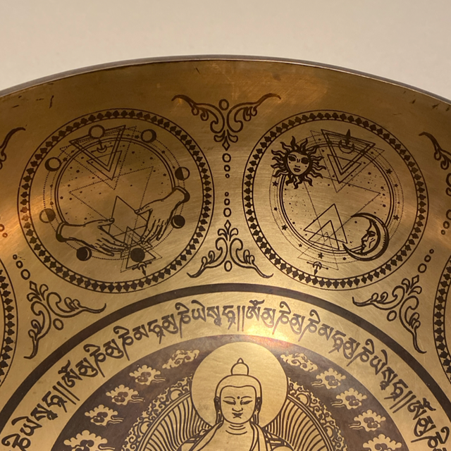 Grosse handgearbeitete Klangschale Motiv: OMPH Mantra und Buddha der die Erde berührt 19cm Durchmesser, Hauptton D